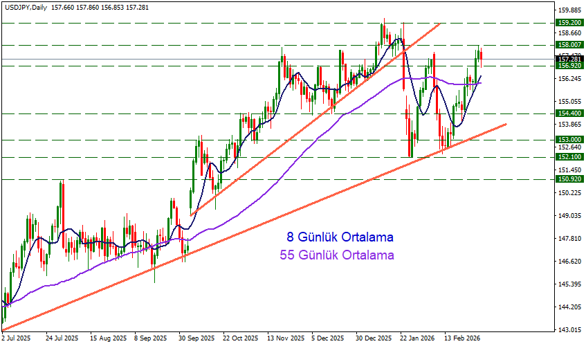 Fiyatlamalar 156.92 desteği ve 158.00 direnci aralığında kalırken, yükselişlerin 158.00 direncini aşması durumunda 159.20 bölgesi bir sonraki direnç olarak takip edilebilir.